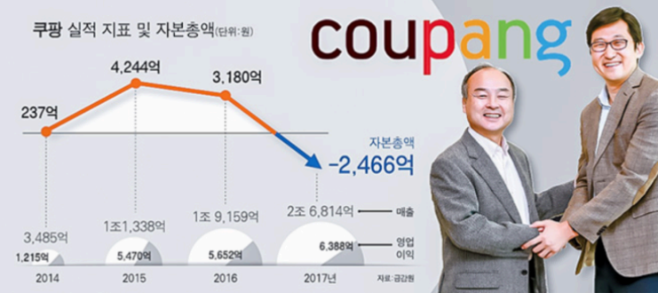 2015년 쿠팡은 감당하기 힘든 적자가 쌓여가고 있었는데 이때 일본 소프트뱅크 손정의 회장은 과감하다 못해 무모하다 싶은 1조 1300억 원을 투자하며 기업을 심폐소생술로 살려냈습니다. 사람들은 손정의 투자가 무모하다고 생각하면서도, 중국 알리바바의 엄청난 성공을 만들어낸 사람이라 일단 지켜보자는 분위기였습니다.